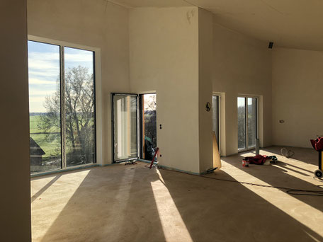 Hier wurde ein wunderschönes Einfamilienhaus auf drei Etagen in einer Split-Level-Bauweise erbaut. Mit hochwertigem Dielenboden, großflächigen Aluminiumfenstern und einem wunderschönen Panorama auf die Mehlberger-Felder